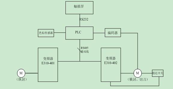 两台E310变频器由一台PLC通讯控制,纵封由一台异步电机单独拖动,横封和切刀由另一台异步电机拖动。正常运行时要求两台电机保持同步,主运行频率由PLC给定,以保证袋长的精度。同时,薄膜标记传感器不断的在检测薄膜标记(色标),机械部分的编码器检测主轴机械位置,上述两种信号送至PLC,经程序运算后,如果偏差超过允许值,则由PLC输出段速信号给控制横封和切刀的变频器,段速的切换由接近开关控制,主轴每转动一圈接近开关导通一次,导通时间占1/3,以时时调整横封和切刀速度,补偿偏差,从而把包装袋长精确控制在一定范围内。检测若在追踪预定次数后仍不能达到技术要求,可自动停机待检,避免废品的产生。